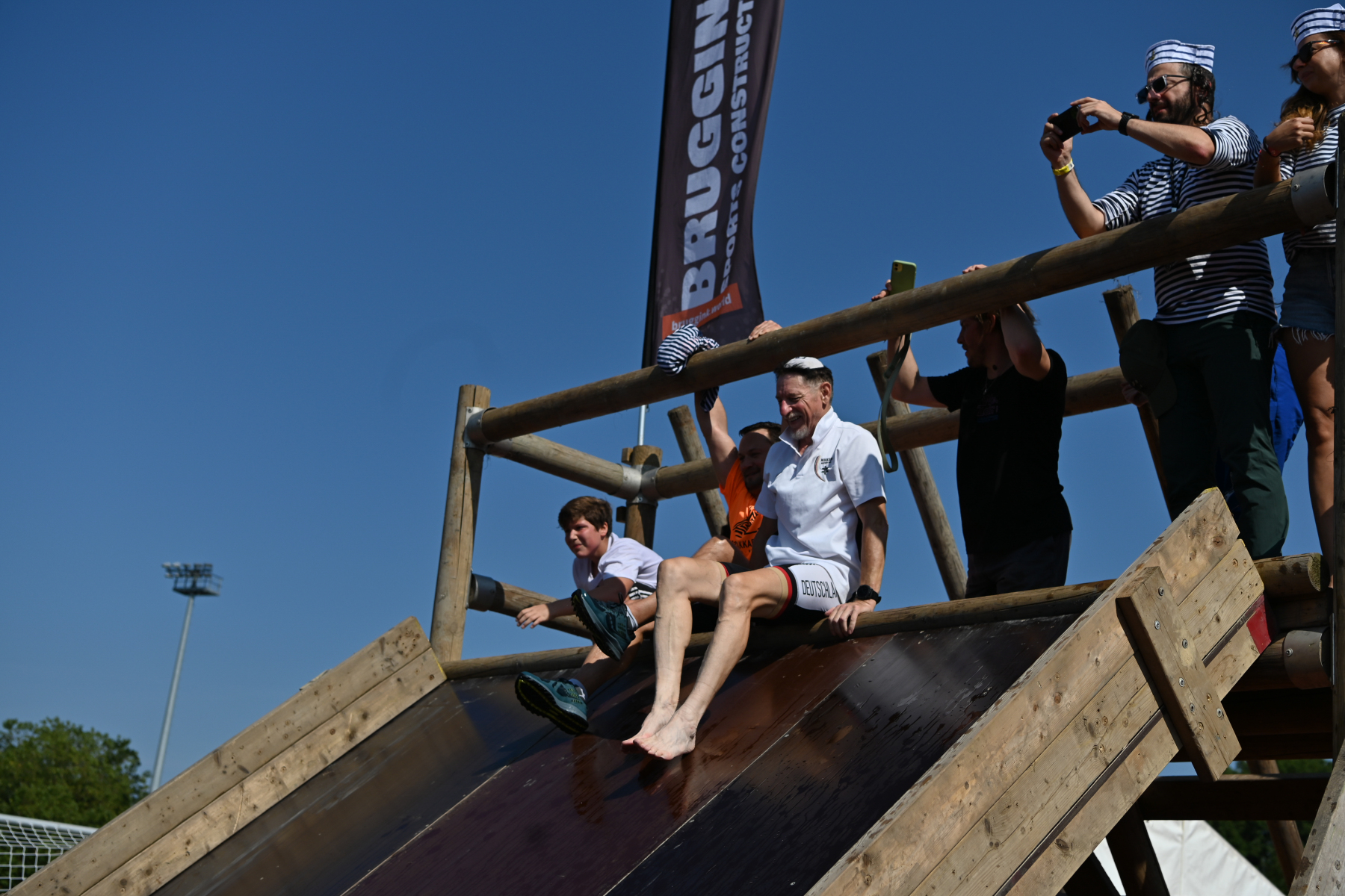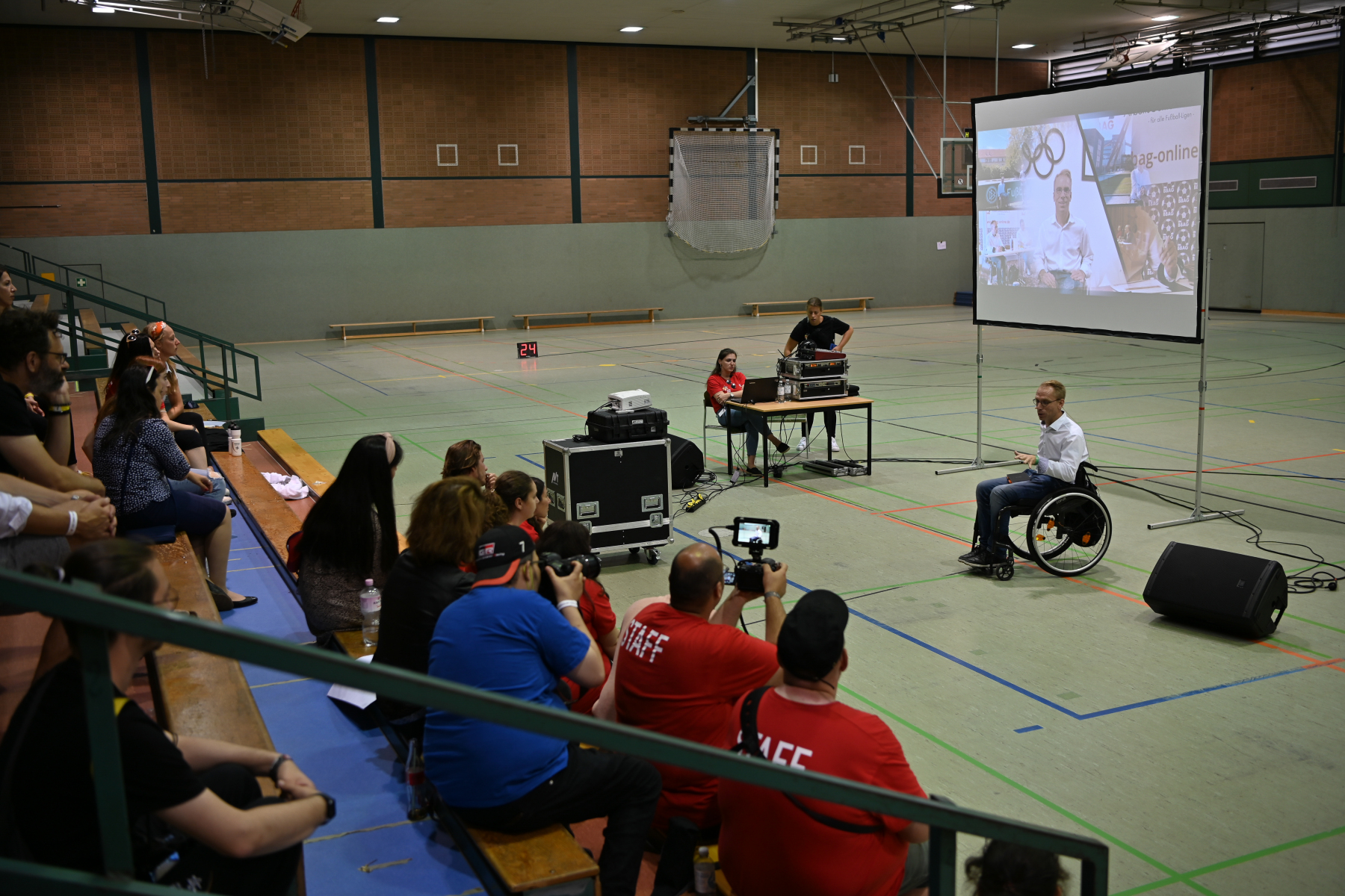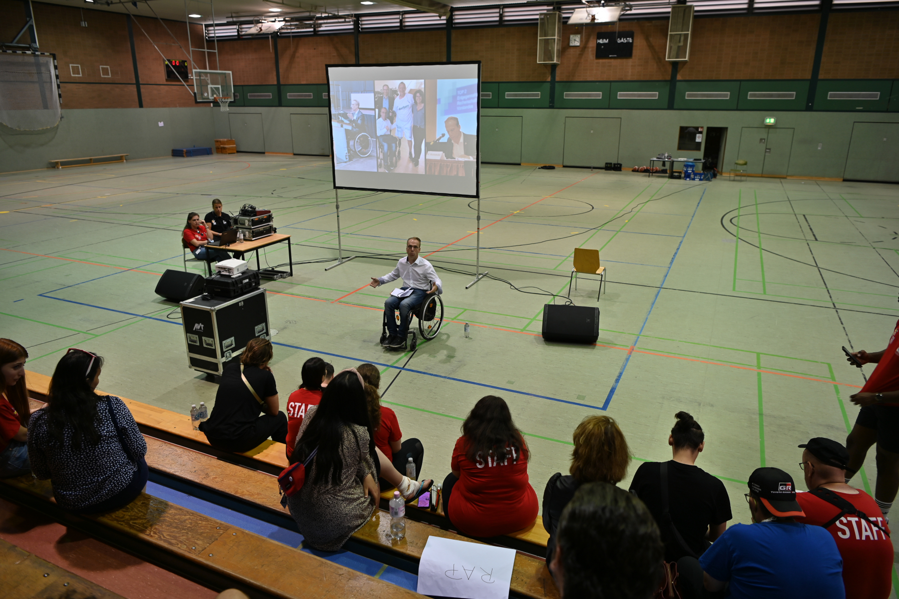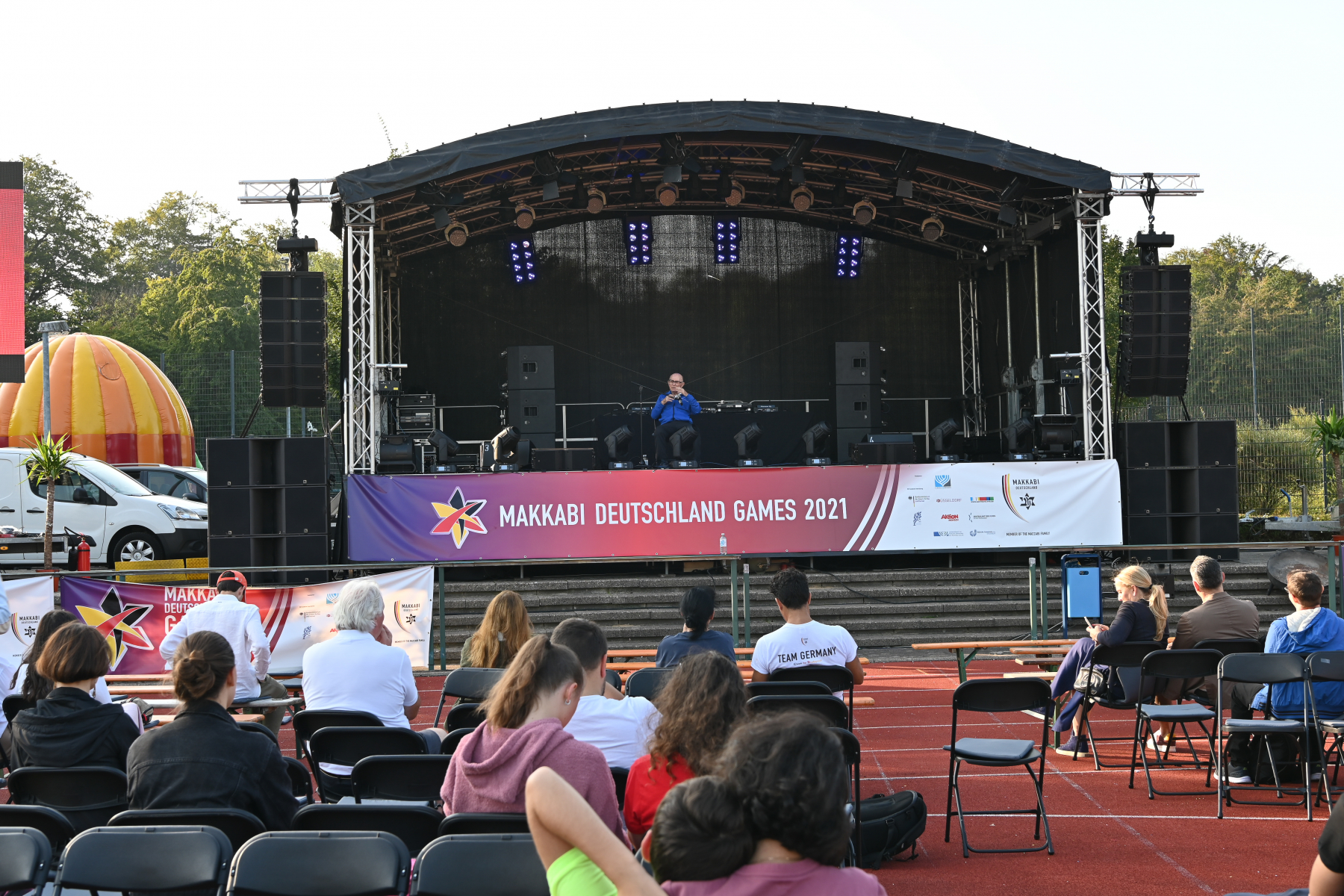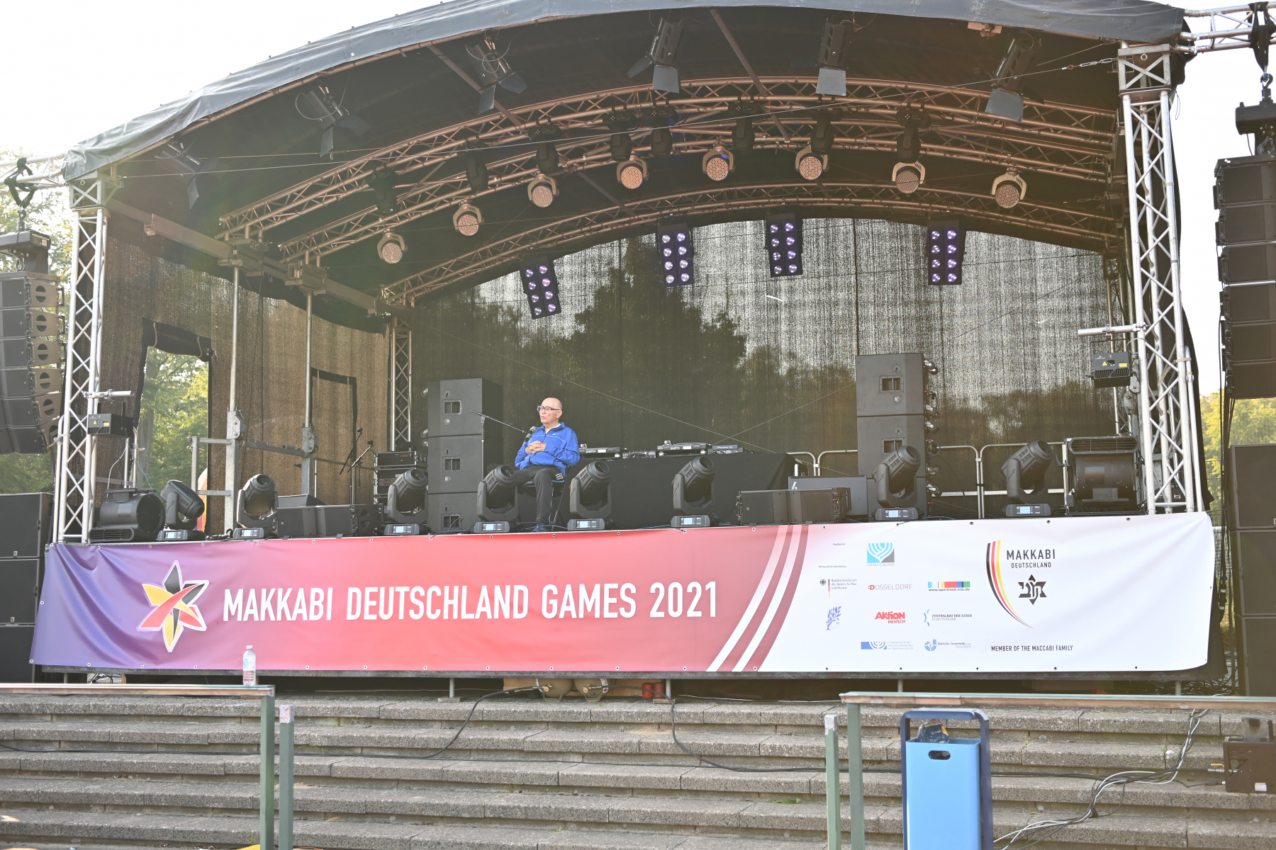 Nach dem feierlichen Einlauf der über 650 Athlet:innen – Mitglieder der MAKKABI-Ortsvereine und Mitglieder der jüdischen Gemeinden im Alter zwischen 12 und 99 Jahren sprachen Alon Meyer (Präsident von MAKKABI Deutschland), Andrea Milz (NRW-Staatssekretärin) und Dr. Stephan Keller (Oberbürgermeister der Stadt Düsseldorf), inspirierende Grußworte. Außerdem durfte MAKKABI den renommierten Fußballexperten und Deutschlandgourmet Reiner Calmund begrüßen, der in seinem Redebeitrag die Wichtigkeit der jüdischen Verbandsarbeit in Sport und Gesellschaft sowie die besondere Freundschaft zwischen Deutschland und Israel hervorhob. Ein besonderer Höhepunkt des Abends war die Verleihung des „Makkabäer-Preises“ an Shaul Ladany. Ladany (85), der den Holocaust und das Olympia-Attentat 1972 in München überlebte, war Marathonläufer und wurde mehrfach israelischer Landesmeister im Gehen. Noch heute übt er den Sport regelmäßig aus – so wie unter der Flagge von MAKKABI Deutschland bei den European Maccabi Games 2019 in Budapest. Im weiteren Verlauf der Eröffnungszeremonie folgte ein vielfältiges kulturelles Begleitprogramm mit musikalischen Darbietungen von Sam Oberhand, Kippalive und Samuel Haas sowie einer Ansprache des Rabbiners Aharon Ran Vernikovsky von der Jüdischen Gemeinde Düsseldorf. Nach der Schlussrede Abraham Lehrers, Vizepräsident des Zentralrats der Juden in Deutschland, wurde die Eröffnungsfeier mit einem großen Feuerwerk beendet. Die sportliche Eröffnung erfolgte bereits einige Stunden zuvor ab 17:30 Uhr im Rahmen eines Fußballturniers zwischen den MAKKABI Allstars, der Traditionsmannschaft der Fortuna Düsseldorf und dem 1.FC Landtag unmittelbar vor der feierlichen Eröffnungszeremonie. Besonderes Highlight: Der CDU-Bundestagsabgeordnete und ehemalige Kunstturner Eberhard Gienger eröffnete das Traditionsturnier mit einem Fallschirmsprung auf das Fußballfeld im Sportpark Niederheid. Den Anstoß für das erste Spiel übernahm danach Reiner Calmund.